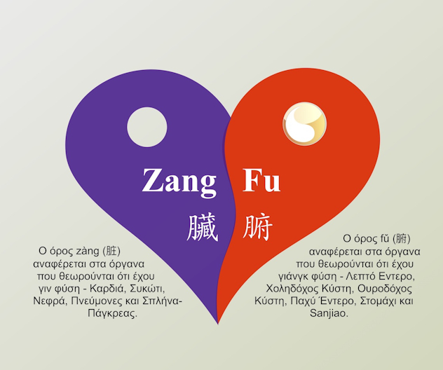 Ο όρος zàng (脏) αναφέρεται στα όργανα που θεωρούνται ότι έχου γιν φύση – Καρδιά, Συκώτι, Νεφρά, Πνεύμονες και Σπλήνα-Πάγκρεας. O όρος fǔ (腑) αναφέρεται στα όργανα που θεωρούνται ότι έχου γιάνγκ φύση – Λεπτό Εντερο, Χοληδόχος Κύστη, Ουροδόχος Κύστη, Παχύ Έντερο, Στομάχι και Sanjiao.